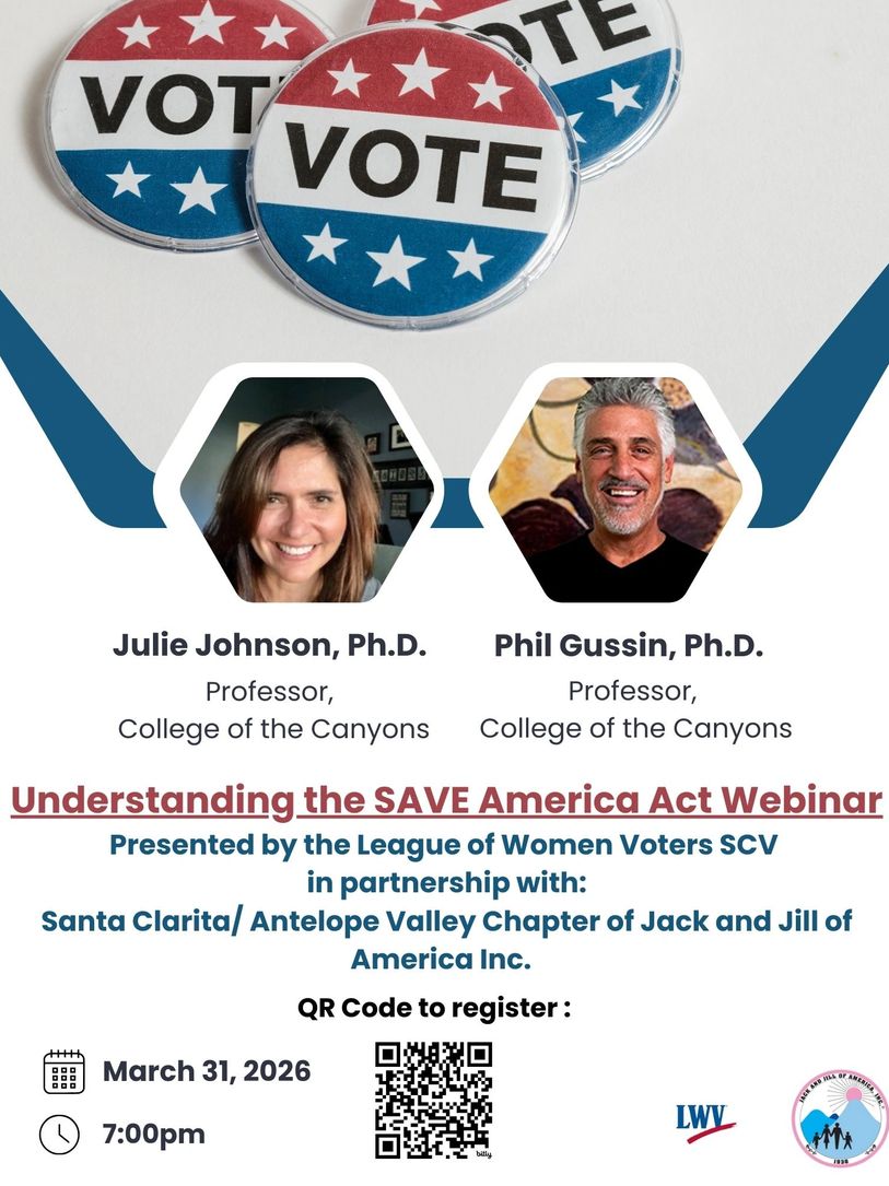 Join this informative webinar to learn about the SAVE America Act and the implications it would have on women. Hear from College of the Canyons Professors Julie Johnson and Phil Gussin. This event is presented by the League of Women Voters SCV and the Santa Clarita/Antelope Valley Chapter of Jack and Jill of America, Inc.